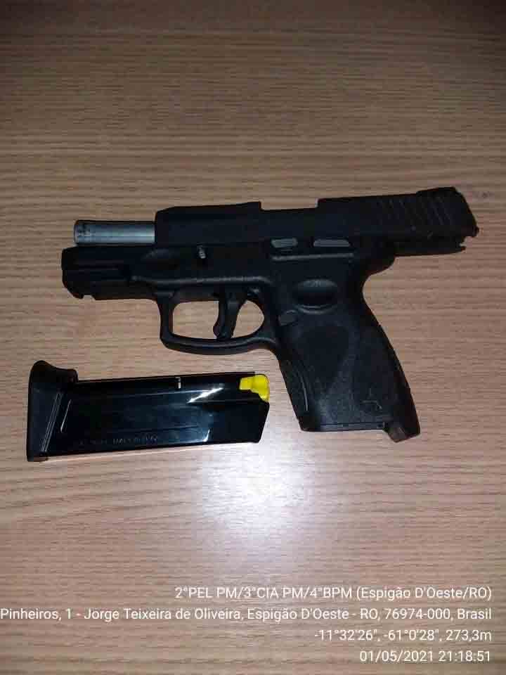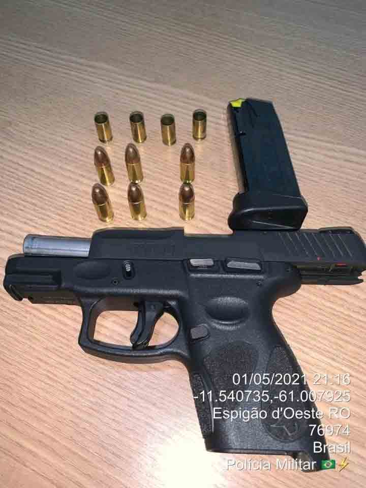 Logo após, chegou a equipe de policiais em apoio, que constatou que a arma de fogo se tratava uma pistola calibre 9mm. Além da arma, foram localizadas várias cápsulas deflagradas de munição 9mm. O individuo estava visivelmente em estado de embriaguês e foi conduzido à Delegacia de Polícia Civil, juntamente com a arma para os demais procedimentos cabíveis ao caso.