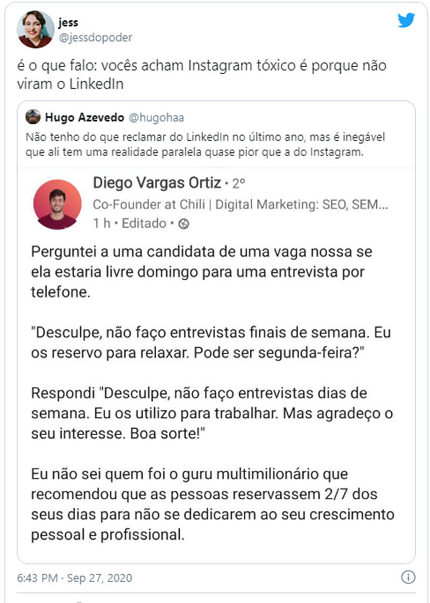 “É o que falo: vocês acham Instagram tóxico é porque não viram o LinkedIn”, escreveu uma internauta identificada como “Jess”. “Cansada de CEO de startup que acha que tá fazendo favores pros empregados”, completou em outro post no Twitter.