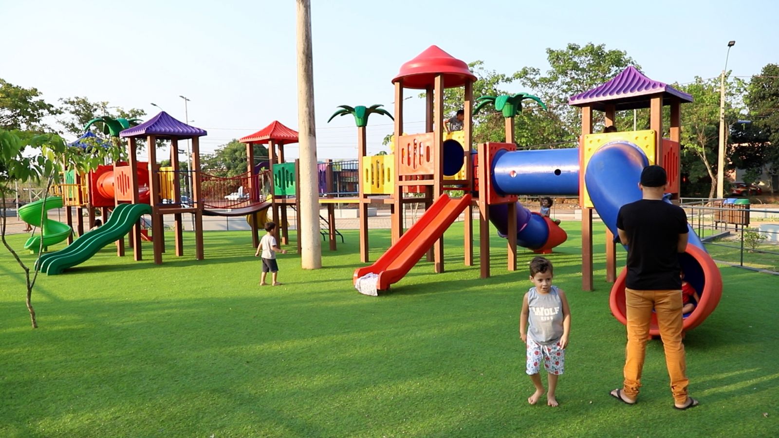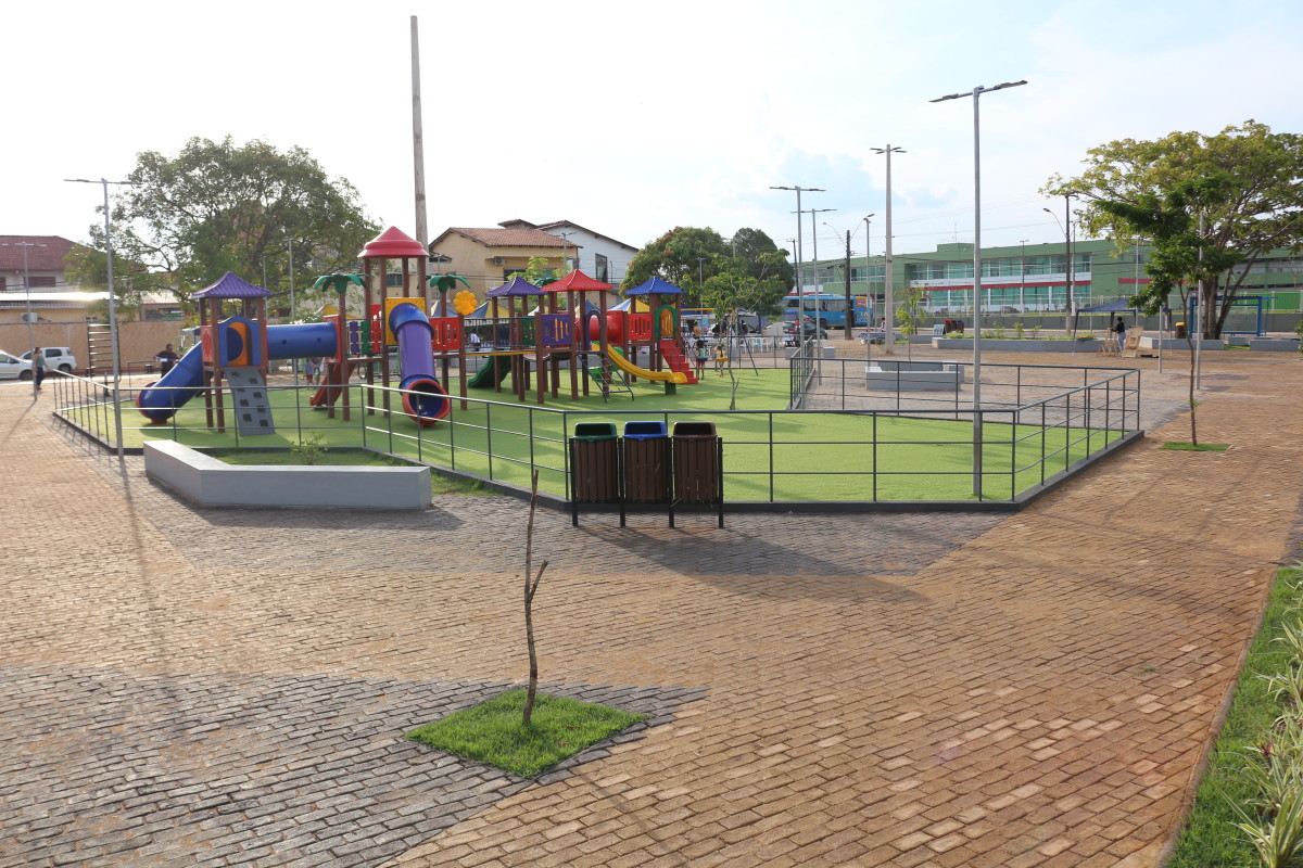 Além do parquinho com brinquedos interativos e coloridos, com grama sintética, a praça conta com academia ao ar livre, pista de caminhada, bancos, mesas, iluminação de LED e espaço para o trabalho dos pequenos empreendedores.