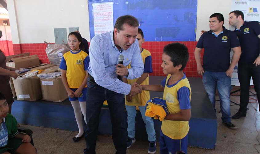 Embora o fornecimento de uniforme escolar aos alunos da rede pública municipal não seja uma obrigação legal da Prefeitura, o prefeito dr Hildon Chaves optou por uma padronização da vestimenta dos alunos, nas cores da bandeira de Porto Velho. Para isso, na manhã desta sexta-feira (16) foi realizada uma cerimônia simbólica de entrega de fardamento escolar, na escola Joaquim Vicente Rondon, a maior da rede municipal, no Cohab, Zona Sul, onde são atendidos mais de mil alunos.