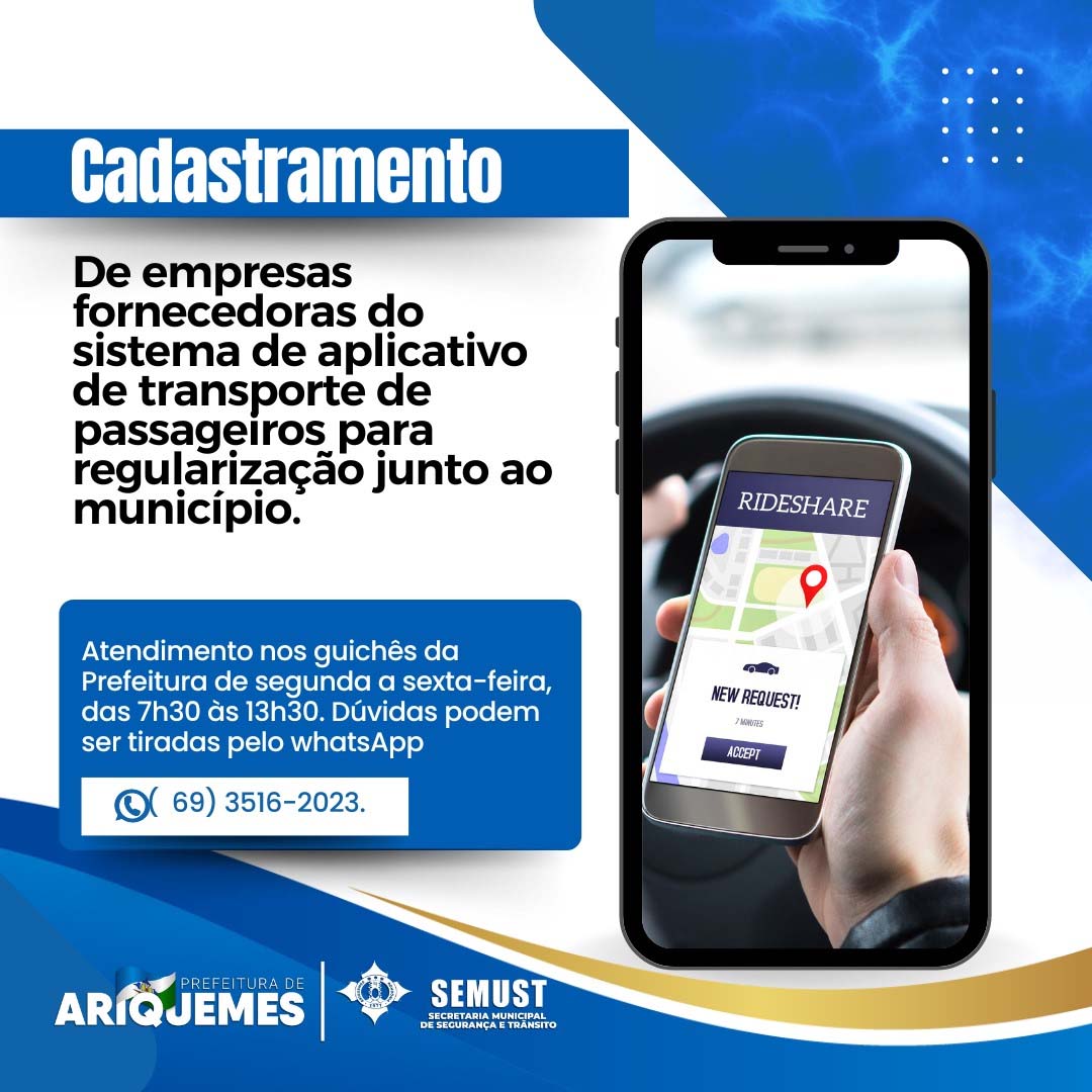 A Prefeitura de Ariquemes, através da Secretaria Municipal de Segurança e Trânsito - SEMUST, convoca as empresas fornecedoras do sistema de aplicativo de transporte de passageiros, para o cadastramento e regularização junto ao município.