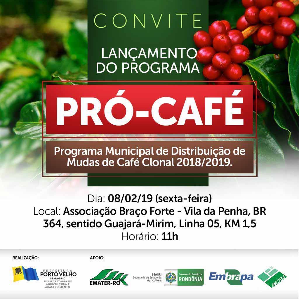 A prefeitura de Porto Velho, através da Subsecretaria Municipal de Agricultura e Abastecimento (Semagric), realizará, nesta sexta-feira (8/2), o lançamento oficial do ‘Programa Pró-Café’. O evento será às 11ho, na Associação Braço Forte, que fica na Vila da Penha, Quilômetro um e meio da Linha 05, BR-364, sentido Guajará-Mirim, distante cerca de 210 quilômetros de Porto Velho.