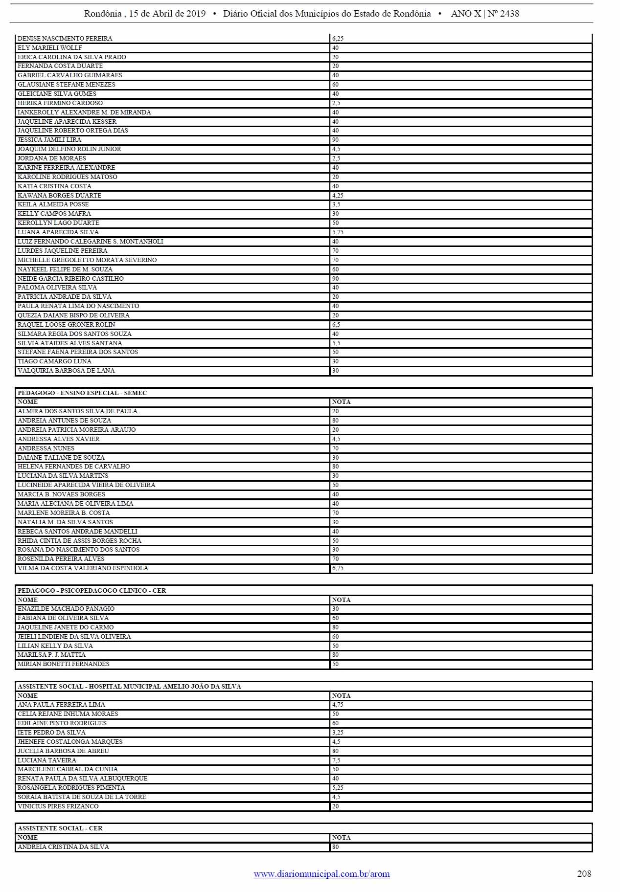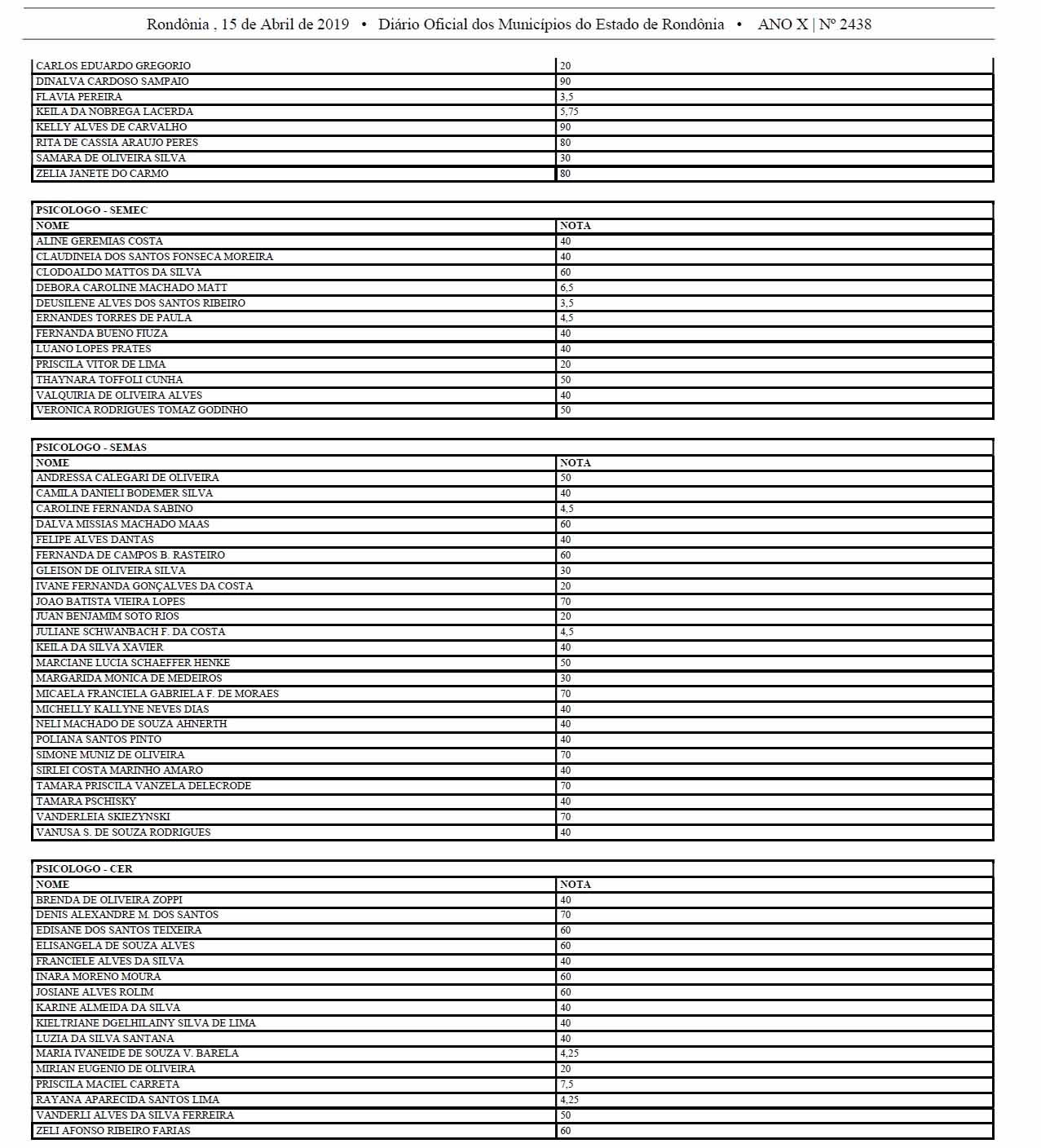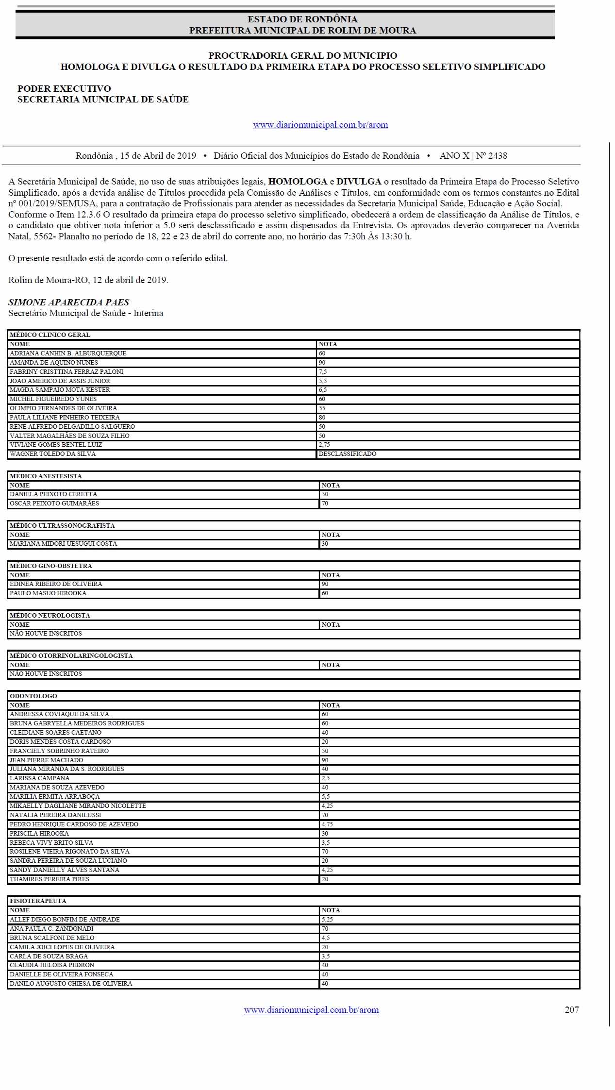 A Prefeitura de Rolim de Moura (RO), divulgou nesta segunda-feira, (15/04), no diário oficial dos municípios Nº 2438, o resultado da Primeira Etapa do Processo Seletivo Simplificado, após a devida análise de Títulos procedida pela Comissão de Análises e Títulos, em conformidade com os termos constantes no Edital nº 001/2019/SEMUSA, para a contratação de Profissionais para atender as necessidades das Secretarias Municipais de Saúde, Educação e Ação Social.