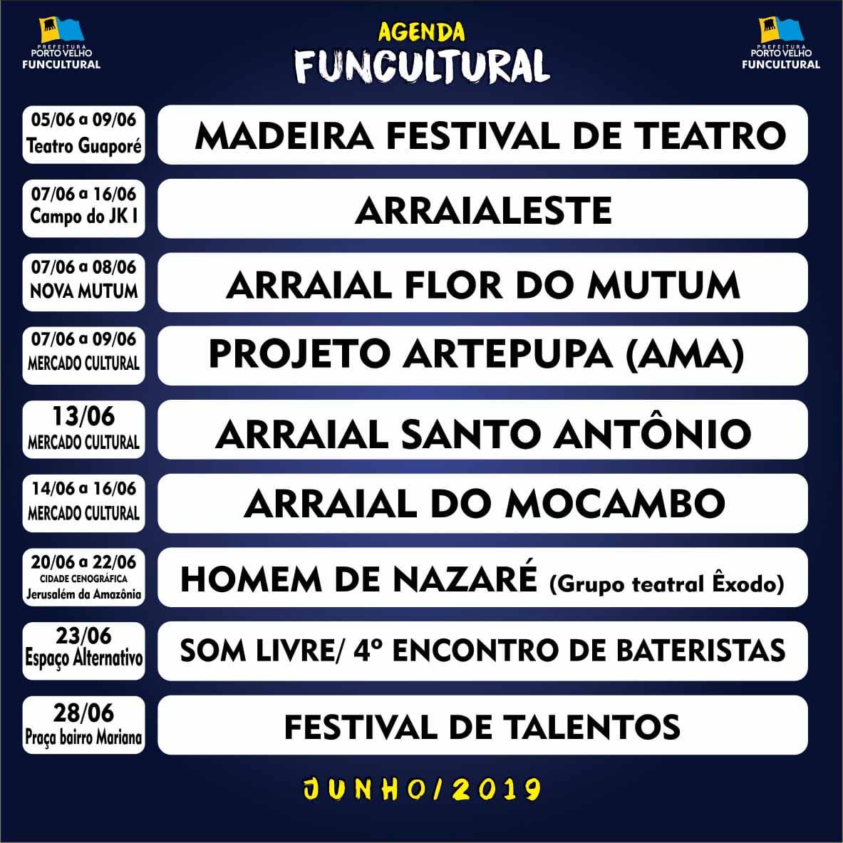 A Prefeitura de Porto Velho, por meio da Fundação Cultural do Município (Funcultural), divulga uma série de eventos para este mês de junho. Teatro, música, espetáculo de fé, festival de talentos e arraiais, serão algumas atrações culturais promovidas pela prefeitura durante este mês de junho.