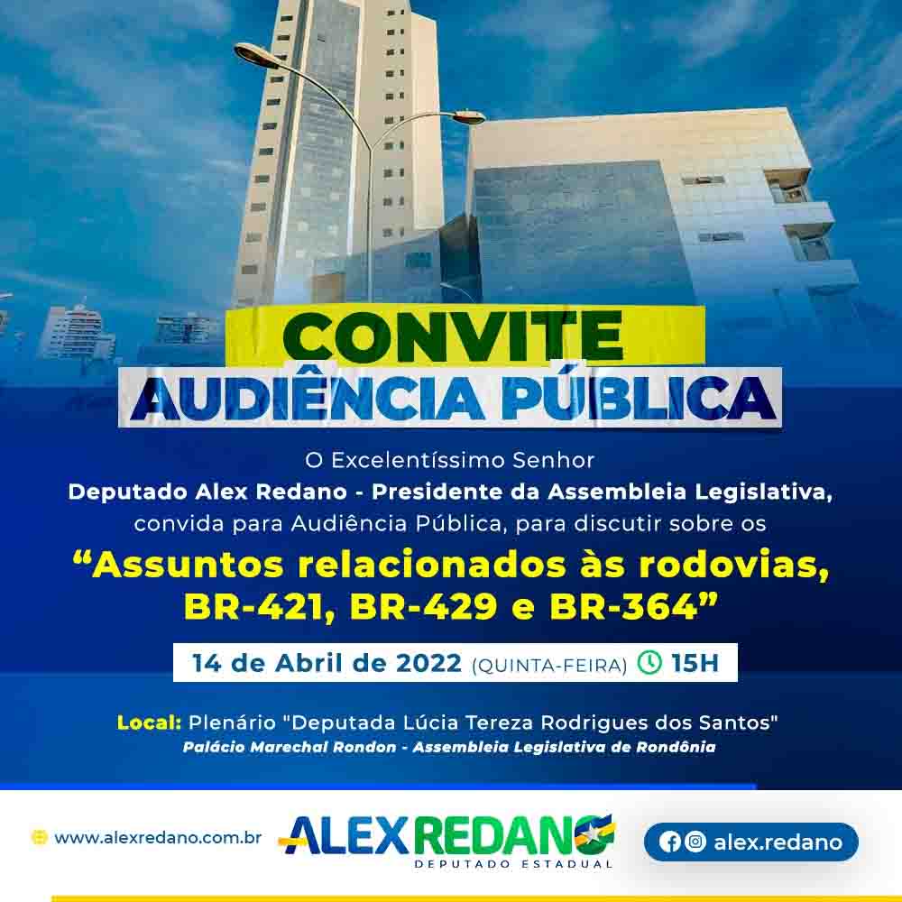 O presidente da Assembleia Legislativa, Alex Redano (Republicanos), confirmou para o próximo dia 14, às 15hs, a realização da audiência pública para discutir sobre a grave situação das rodovias federais BR-364, BR-421, BR-429 e demais que cortam Rondônia, que causam transtornos aos motoristas, que enfrentam longos trechos esburacados e com outros problemas.