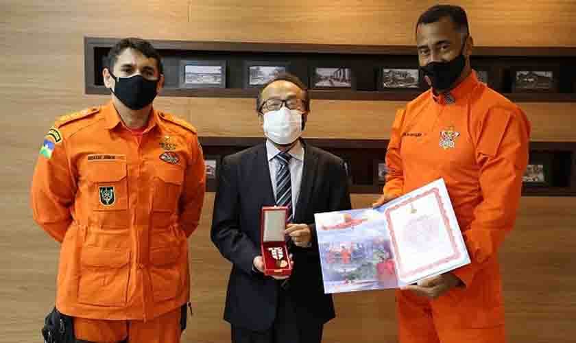 O presidente do Tribunal de Justiça de Rondônia, desembargador Paulo Kiyochi Mori, agradece ao Corpo de Bombeiros Militar de Rondônia pela importante honraria que lhe foi concedida: a medalha Capitão Bombeiro Militar Esron Penha de Menezes, como prova de reconhecimento pelos notáveis serviços prestados à Corporação.