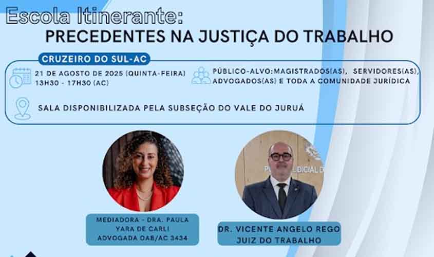 A programação segue na quinta-feira (21/8) em Cruzeiro do Sul (AC), em sala disponibilizada pela Subseção do Vale do Juruá, onde o tema será abordado pelo juiz Vicente Rego, sob a mediação da advogada Paula Yara de Carli.