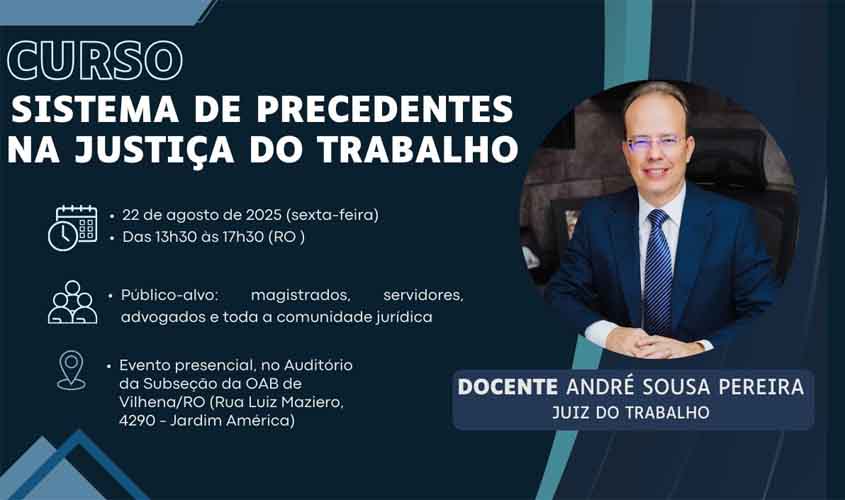 Por fim, a semana encerra com o curso sendo aplicado também no município de Vilhena (RO), sob a docência do juiz do Trabalho titular da VT de Vilhena, André Sousa Pereira. O evento acontece nas dependências da Subseção da OAB-RO, das 13h30 às 17h30.