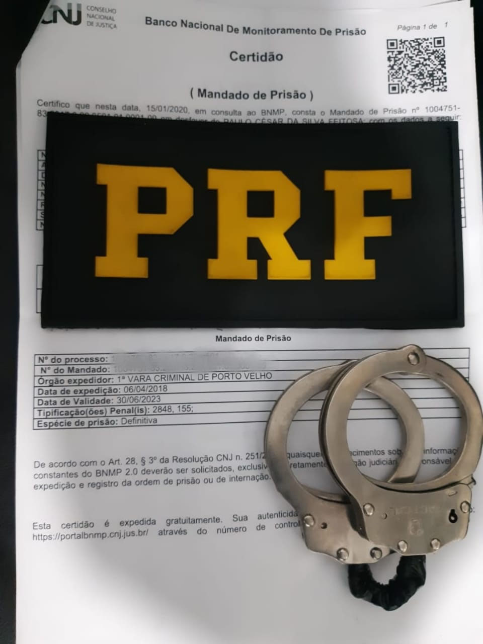 Já por volta 23h50, os policiais deram ordem de parada a um ônibus, que seguia a linha Porto Velho x Pimenta Bueno (RO), no km 698 da BR-364. Ao checar nos sistemas a documentação de um dos passageiros, a guarnição constatou a existência de um mandado de prisão expedido pela 1ª Vara Criminal de Porto Velho, em razão de condenação por furto.