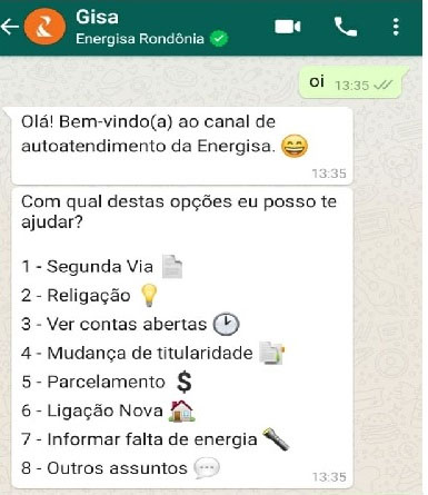 A Energisa montou uma estrutura exclusiva para parcelamento em seus canais de atendimento. Pela Whatsapp Gisa, é possível parcelar os débitos sem sair de casa. “Ampliamos a capacidade de atendimento em 30% nos canais digitais para que o cliente seja atendido rapidamente e oferecendo as melhores condições de parcelamento de acordo com cada perfil”, conta.