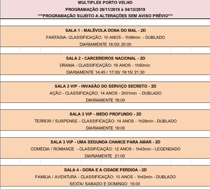 Programação de 28/11/2019 à 04/12/2019
