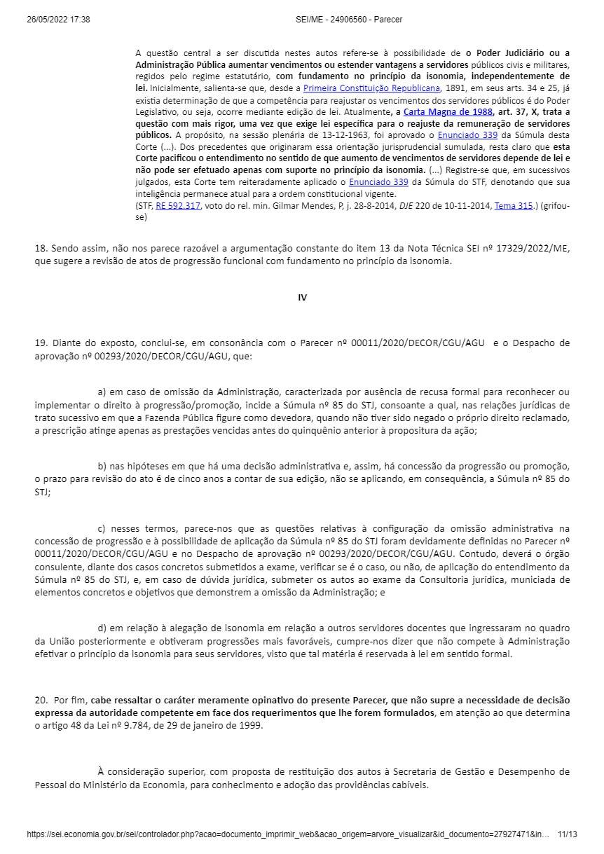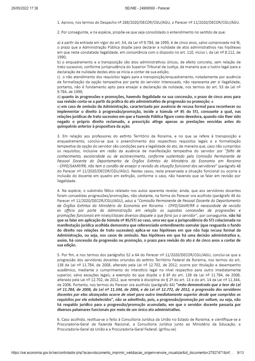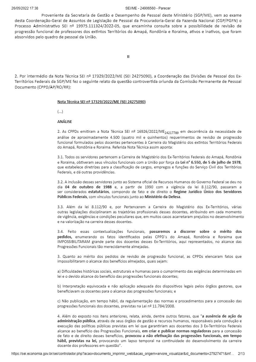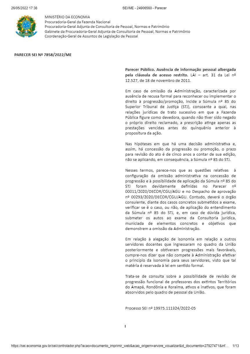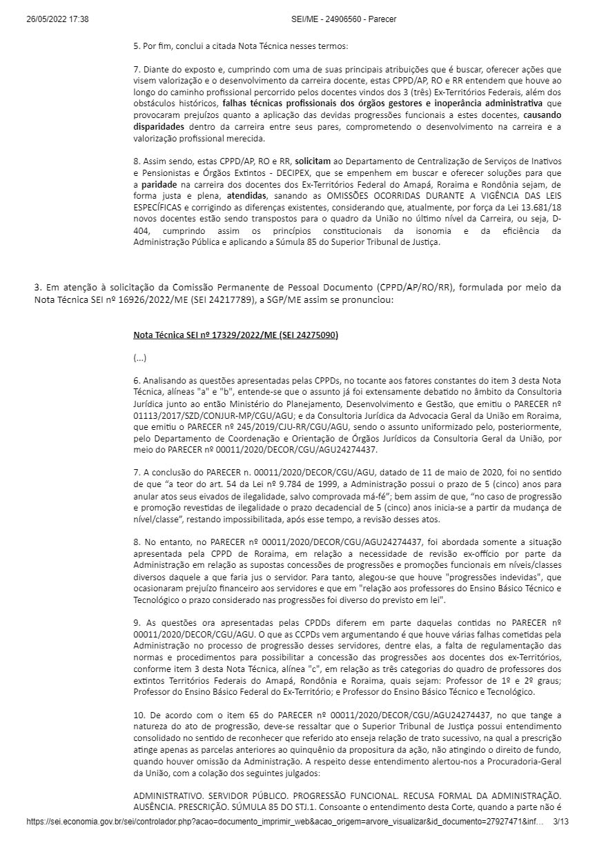 Entretanto, mesmo com a suposta mobilização anunciada pela Comissão representativa dos professores e técnicos do Ministério da Economia, o que se constatou de concreto foi uma decisão negativa proferida pela Procuradoria Jurídica, por meio do Parecer 7858/2022/ME, de 25 de maio de 2022, manifestação esta que a Comissão escondeu da categoria, de seus próprios colegas, por mais de três meses, o que gerou enorme decepção entre os professores de Rondônia, Amapá e Roraima.