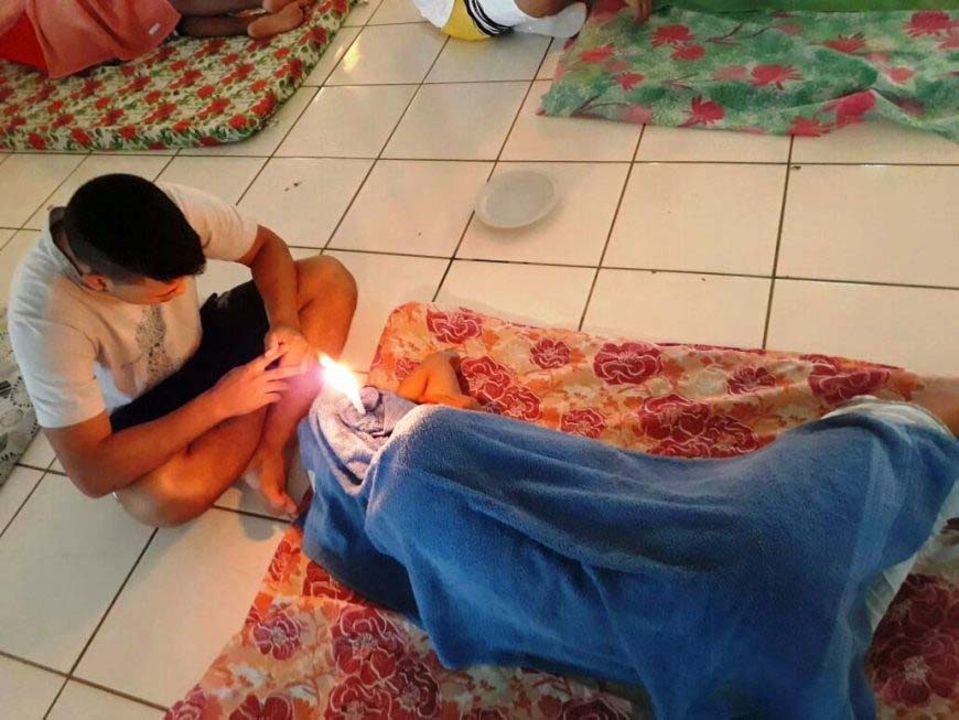Adolescente recebendo a terapia com cone chinês, uma técnica milenar de medicina natural não invasiva.