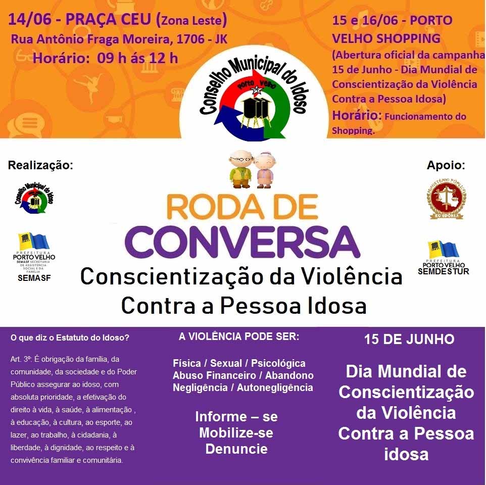O projeto ‘Roda de Conversa – Conscientização da Violência contra a Pessoa Idosa’ será realizado nos dias 14, 15 e 16 deste mês. A iniciativa é uma realização do Conselho Municipal dos Direitos da Pessoa Idosa (CMI) e da Prefeitura de Porto Velho, através da Secretaria Municipal de Assistência Social e da Família (Semasf) e da Subsecretaria Municipal de Indústria, Comércio, Turismo e Trabalho (Semdestur). O projeto também conta com apoio do Ministério Público de Rondônia.