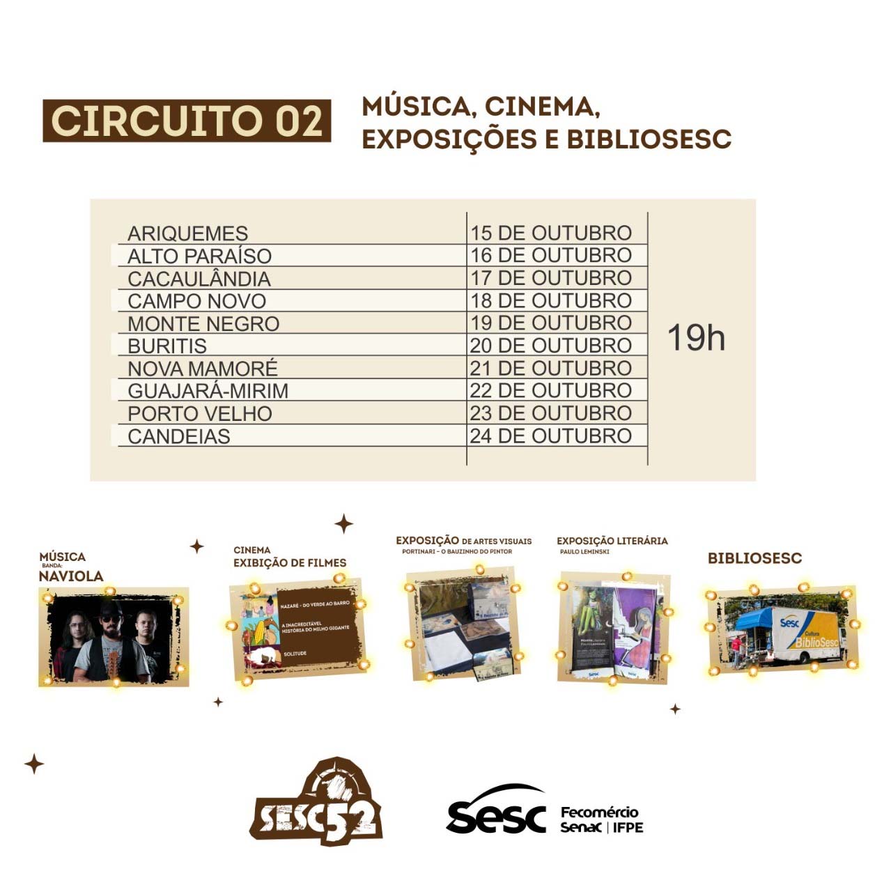 O Sistema Fecomércio/Sesc/Senac/IFPE de Rondônia, por meio do Sesc/RO, reafirmando seu objetivo de integração, inclusão social e fomentador da cultura regional, realiza a partir do dia 04 outubro a 2ª etapa do projeto de circulação cultural que estabelece uma conexão de programações artísticas entre todas as cidades do estado de Rondônia. Intitulado Sesc 52, o projeto viabiliza o acesso da população de cada cidade com a produção artística de forma diversificada, por meio da oferta de produtos culturais regionais.