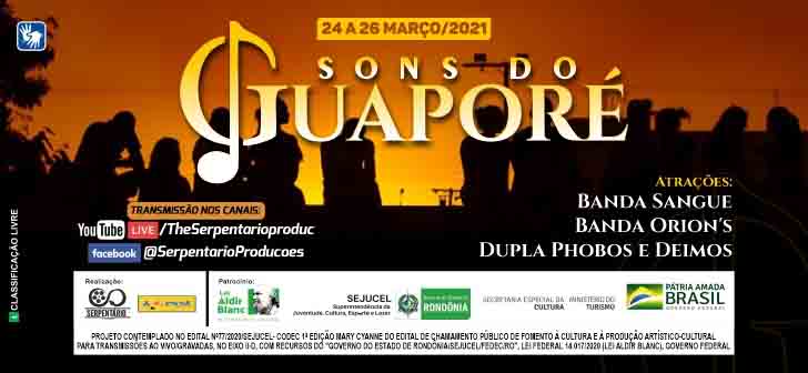 Com muita música boa e autoral começa nesta quarta-feira (24) o projeto Sons do Guaporé através de lives com transmissão de Vilhena (RO). O projeto será realizado entre os dias 24 a 26 de março.