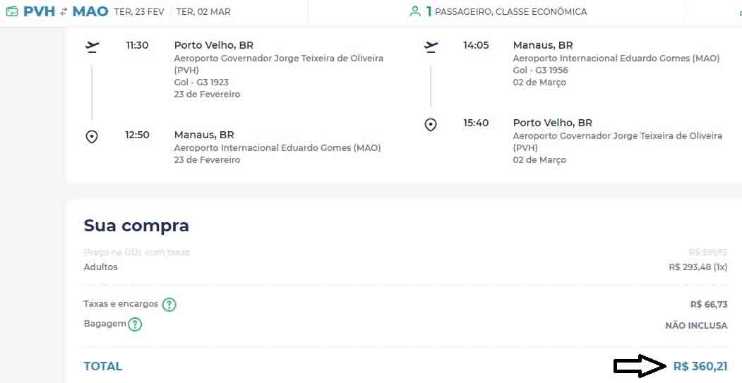 Passagens aéreas de ida e volta com taxas incluídas nos voos saindo de PORTO VELHO