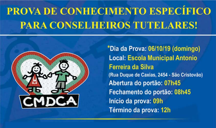 A Comissão Especial Eleitoral e o Conselho Municipal do Direito da Criança e do Adolescente (CMDCA) informa que a prova de Conhecimento Específico para o 2º Processo de Escolha Unificado para Conselheiros Tutelares do município de Porto Velho será nesse domingo (6), na escola municipal Antônio Ferreira da Silva, à rua Duque de Caxias, 2454, bairro São Cristóvão.