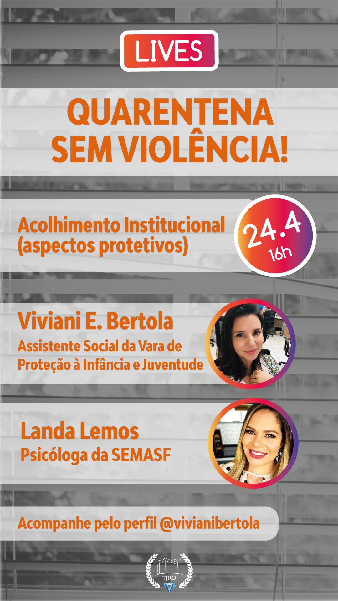 O Acolhimento Institucional é o tema da live que será realizada nesta sexta-feira, 24-04, às 16 horas, na programação da Campanha Quarentena sem Violência, do Tribunal de Justiça de Rondônia. A assistente social Viviane Bertola, da Vara de Proteção à Infância e Juventude, falará sobre os aspectos protetivos das medidas, previstas no Estatuto da Criança e do Adolescente.
