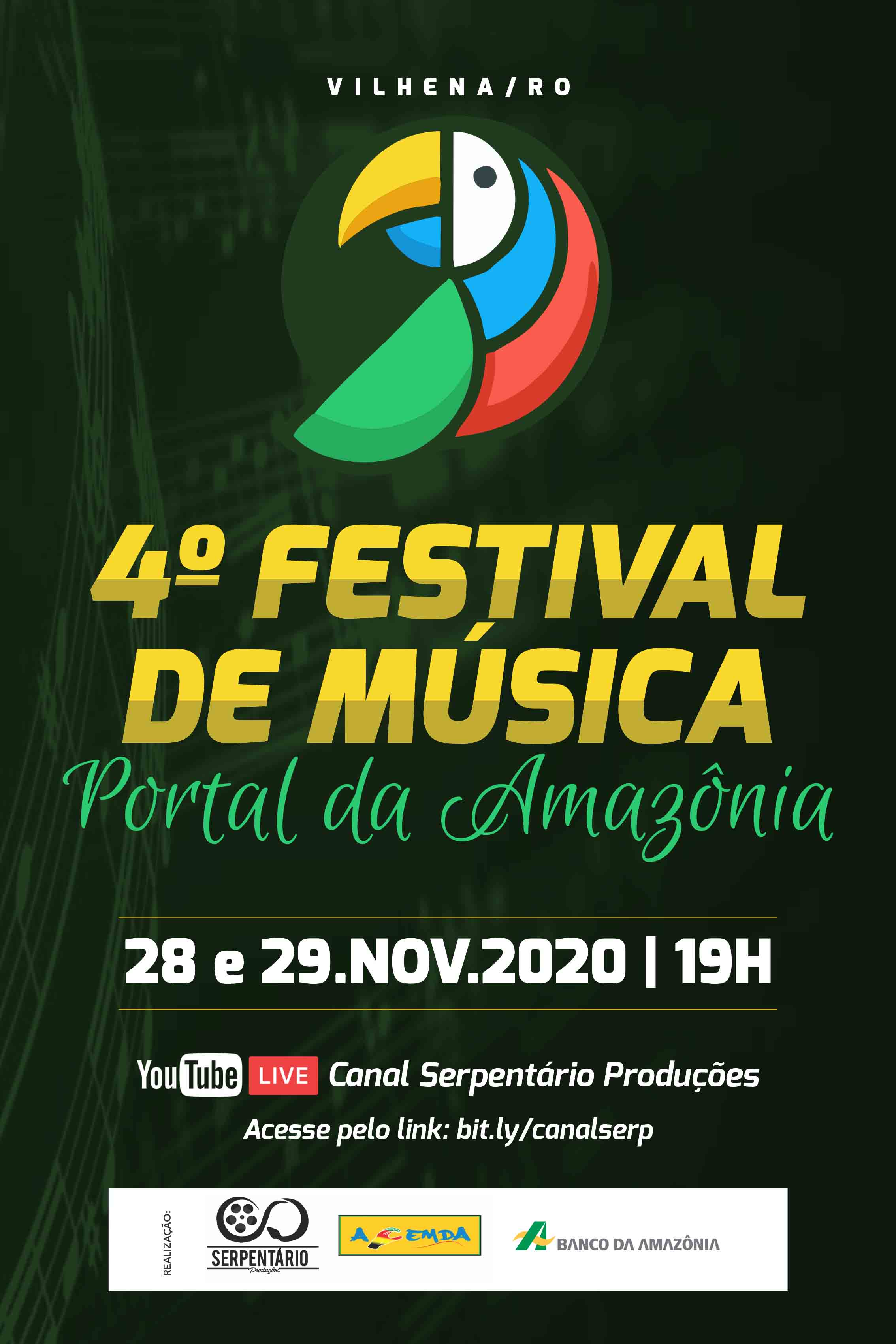 Com objetivo de valorizar a cultura e a música rondoniense será realizado nos dias 28 e 29 de novembro, em Vilhena o “4º Festival de Música Portal da Amazônia”. O evento conta com patrocínio do Banco da Amazônia e está sendo realizado pelos membros do Ponto de Cultura e Mídia Livre Serpentário Produções e da Associação Diversidade Amazônica.