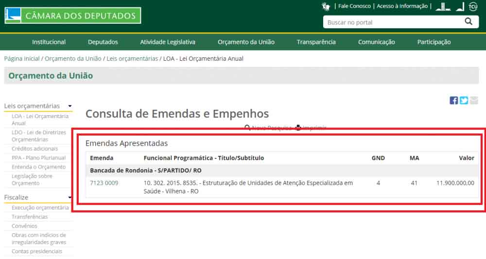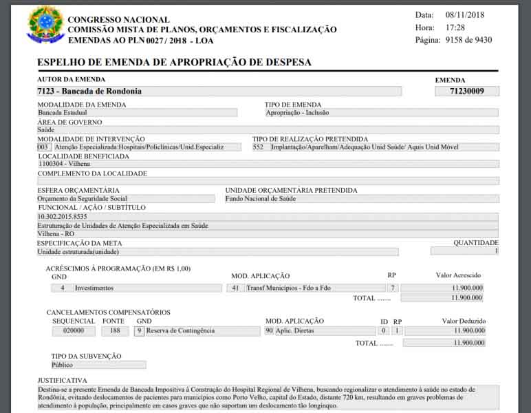 O tema de hoje é o recurso de R$ 11.900.000,00 destinados pela emenda impositiva n° 7123.0009 da Bancada de Rondônia para a construção de um novo prédio para o Hospital Regional de Vilhena, que sofre com problemas estruturais há décadas. O recurso já foi incluído na Lei Orçamentária Anual de 2019, aprovada em novembro de 2018 pela Câmara dos Deputados (veja imagens em anexo).