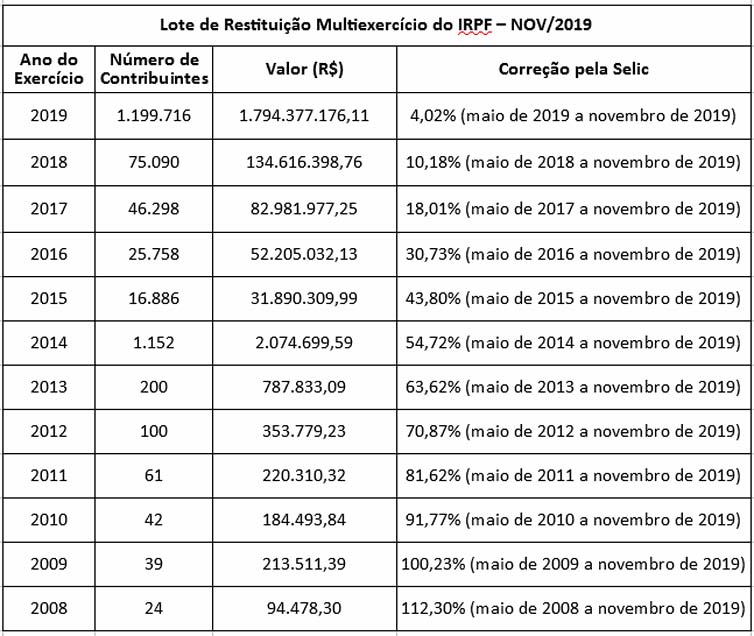 Confira a tabela com os montantes de restituição para cada exercício e taxa básica de juros, a Selic, usada para corrigir os valores: