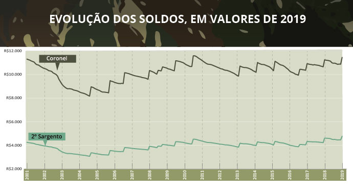 Ao justificar o reajuste salarial, o governo argumentou que os militares das Forças Armadas tiveram perdas desde 2001, quando a Medida Provisória 2215-10 reestruturou as carreiras pela última vez. De lá até janeiro, o soldo do 2º sargento teve aumento acumulado acima da inflação (IPCA) de 11,9%. No caso do coronel o aumento real é de apenas 1,0%.