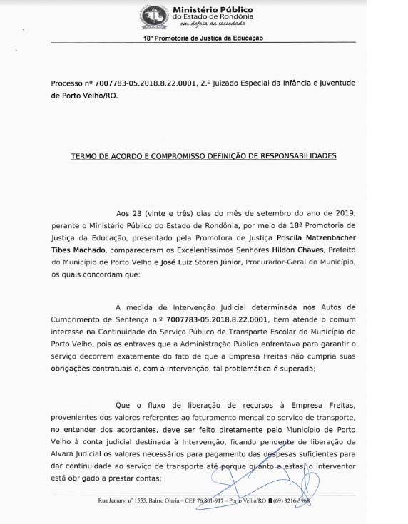 A Prefeitura de Porto Velho firmou termo de acordo e compromisso com definição de responsabilidades junto a 18ª Promotoria de Justiça da Educação de Rondônia, na manhã desta segunda-feira (23/9), em relação a determinação judicial para intervenção do Estado na empresa Freitas, a qual não cumpriu o contrato com o Município para fazer o transporte escolar terrestre.