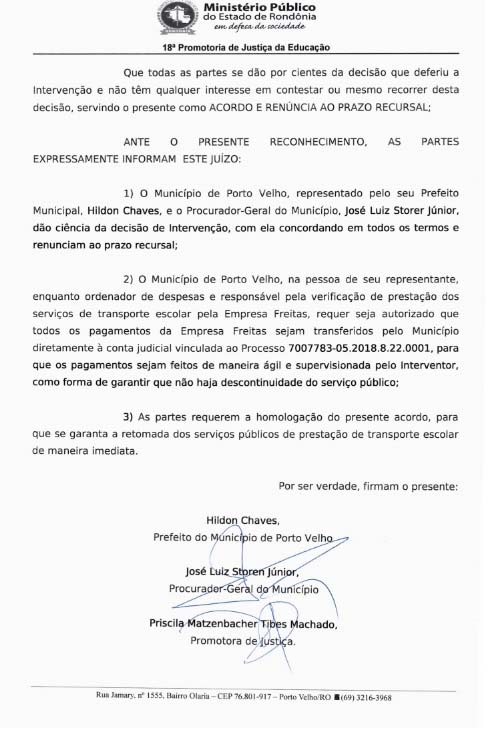 Hildon Chaves ainda requereu a promotora de justiça Priscila Matzenbacher Machado, autorização para que todos os pagamentos a empresa Freitas sejam transferidos pelo Município diretamente para a conta judicial vinculada ao processo de intervenção de nº 7007783-05.2018.8.22.0001, como forma de dar mais transparência às suas ações e garantia da retomada do transporte escolar.