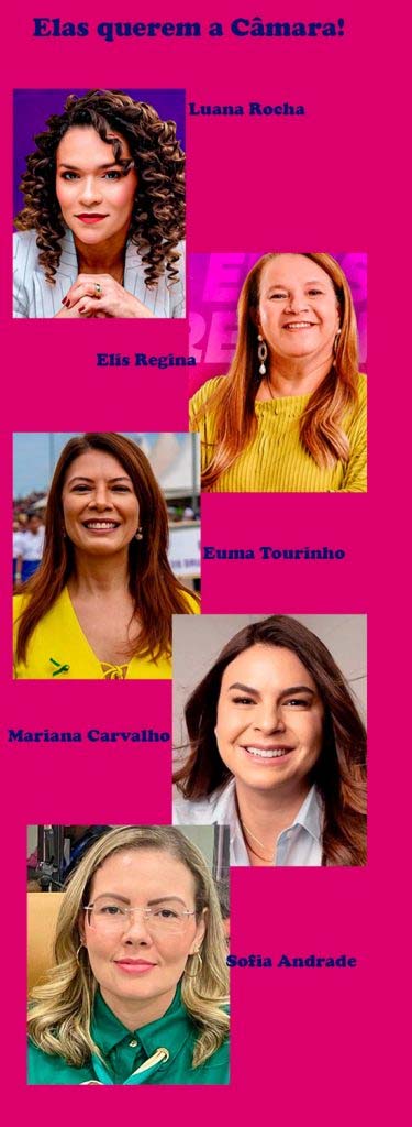 Claro que sem contar os nomes dos atuais deputados e deputadas, haverá sim um pacotaço de novos concorrentes às nossas oito cadeiras da Câmara Federal do ano que vem. No grupo feminino, Sílvia Cristina deve concorrer ao Senado, mas Cristiane Lopes é nome quentíssimo para mais um mandato. Mas várias lideranças estão vindo com tudo, querendo espaço no Congresso. Uma candidatura quentíssima é a da primeira dama Luana Rocha. Outra, da juíza aposentada Euma Tourinho. Se entrar na briga, Mariana Carvalho tem chance real. As têm também as vereadoras de Porto Velho Sofia Andrade, à direita e a sindicalista Elias Regina, à esquerda.