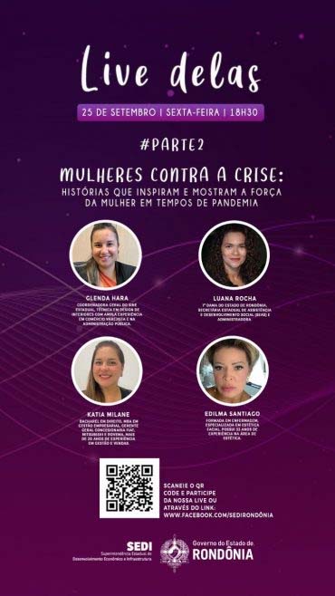 A “Live delas” está de volta. Após o sucesso da primeira edição, a Superintendência Estadual de Desenvolvimento Econômico e Infraestrutura (Sedi), realizará a parte 2 da live sobre: Mulheres contra a crise: História que inspiram e mostram a força da mulher em tempos de pandemia, nesta sexta-feira (25), às 18h30, através da plataforma on-line (https://www.facebook.com/sedirondonia/).
