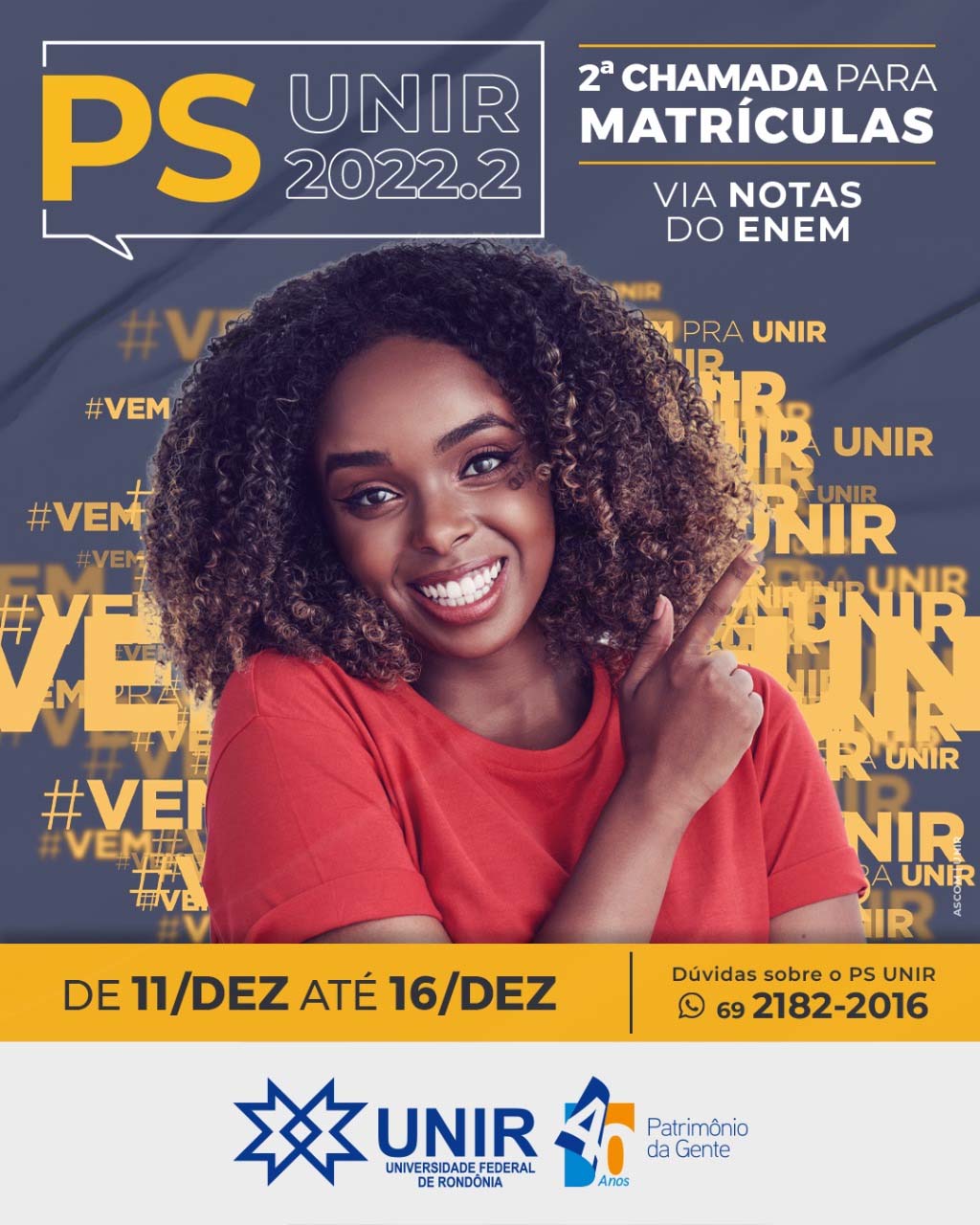 A Universidade Federal de Rondônia (UNIR) realiza até o dia 16 de dezembro, às 18h, as matrículas em segunda chamada dos candidatos aprovados no PS UNIR 2022 para os cursos com entrada no segundo semestre letivo (2022.2). Nesta segunda chamada são convocados para matrículas candidatos aprovados por meio das notas do Enem para cursos nos campi de Cacoal (Direito) e Porto Velho (Ciências Biológicas-Bacharelado, Ciências Contábeis, Direito, Enfermagem e Engenharia Civil). Todas as matrículas devem ser realizadas de modo online por meio deste link.