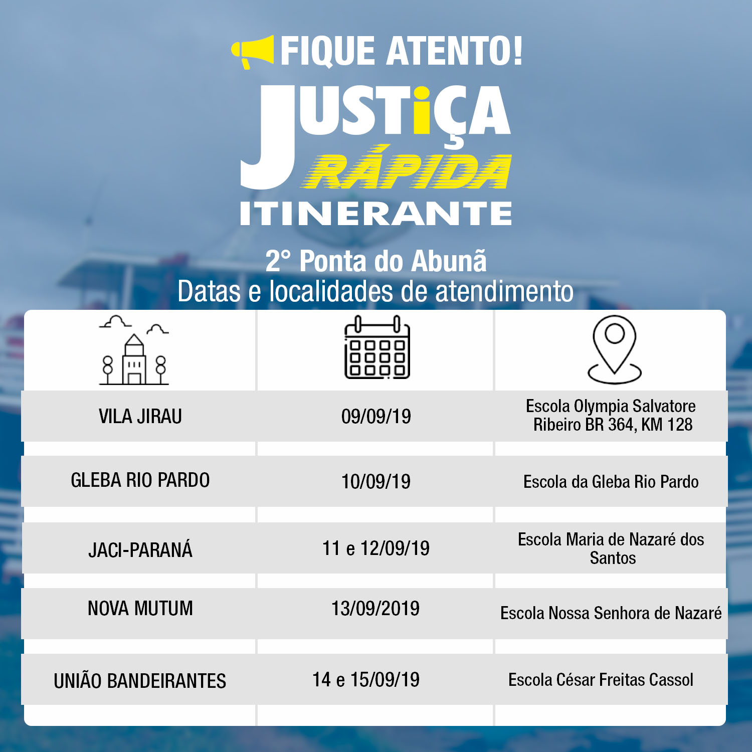 Na próxima segunda-feira (9), a Justiça Rápida Itinerante dará início aos atendimentos na região da 2ª ponta do Abunã. As triagens acontecem no período de 9 à 15 de setembro, nos cinco distritos da região de Porto Velho. As datas das triagens foram definidas pelo Centro Judiciário de Solução de Conflitos e Cidadania (Cejusc), do Tribunal de Justiça de Rondônia.