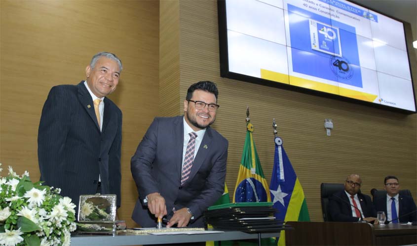 A Assembleia Legislativa do Estado de Rondônia promoveu, nesta segunda-feira (20), a obliteração do selo personalizado e apresentação do carimbo comemorativo, produzidos pelos Correios em comemoração aos 40 anos da promulgação da primeira Constituição Estadual. Durante toda a semana, haverá diversas atividades voltadas para a celebração da data.