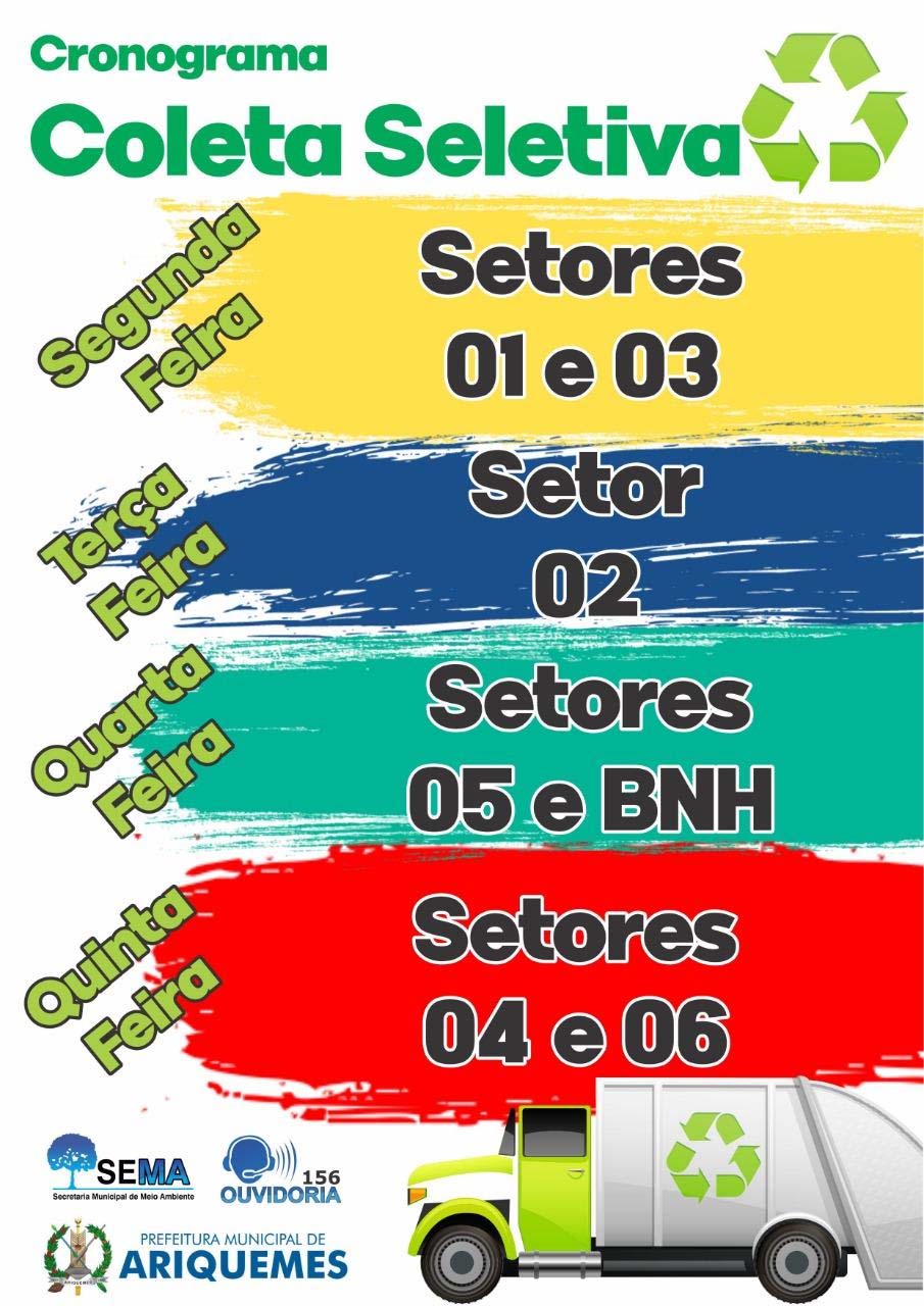 A Prefeitura de Ariquemes, por meio da Secretaria Municipal de Meio Ambiente (SEMA), divulga o cronograma dos bairros e dias da semana que ocorrem a Coleta Seletiva.