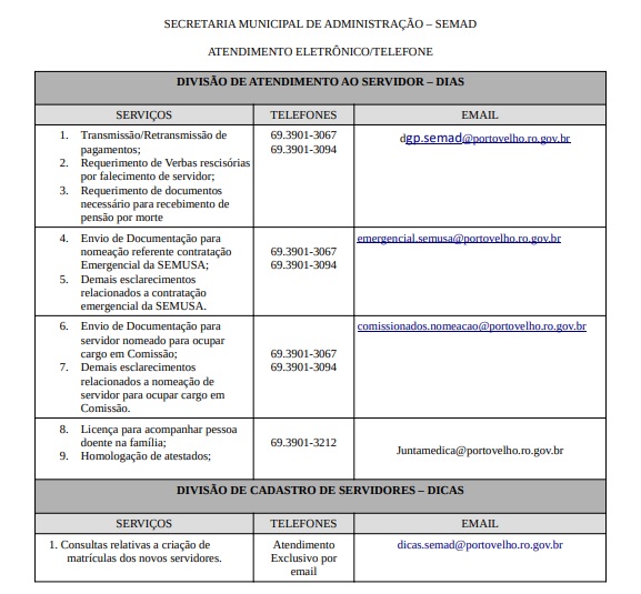 Enquanto durarem os efeitos do Decreto, o atendimento presencial na Secretaria Municipal de Administração (Semad) está interrompido. “Apenas atendimento ao público externamente está suspenso. O serviço não vai parar. Passa a ser feito remotamente por meios tecnológicos disponíveis, como apresentado no Anexo I da Portaria N°33/ASTEC/GAB/SEMAD, de 03 de março de 2021”, esclareceu o secretário Alexey da Cunha Oliveira.
