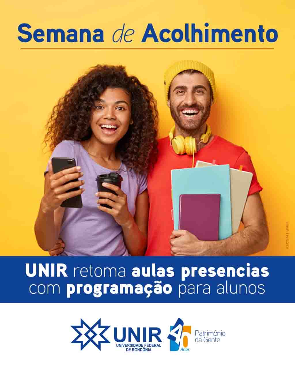 A Universidade Federal de Rondônia (UNIR) volta às aulas presenciais a partir desta segunda-feira, dia 25, depois de dois anos em que as atividades acadêmicas foram realizadas pelo regime do ensino remoto emergencial. E para celebrar este retorno todos os campi estão preparando programações de acolhida, com parte delas sendo comuns a toda a Universidade, uma vez que serão transmitidas via Youtube. Em Porto Velho a programação segue por toda a semana, começando pela homenagem às vítimas da Covid e chegando a jogos de diferentes modalidades esportivas e discussões sobre ações e políticas universitárias.