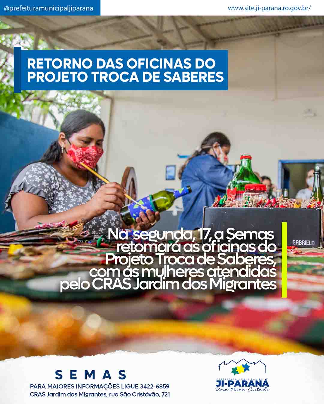 A Prefeitura de Ji-Paraná, por meio da Secretaria Municipal de Assistência Social (Semas), retomará, na próxima segunda-feira (17), o Projeto Troca de Saberes, com as mulheres atendidas pelo Centro de Referência em Assistência Social (CRAS) Jardim dos Migrantes.