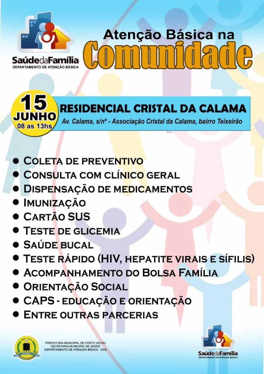 A próxima edição do ‘Projeto Atenção Básica na Comunidade’, da Secretaria Municipal de Saúde de Porto Velho, será realizada neste sábado (15/6), no Residencial Cristal da Calama, das 8h às 13h.