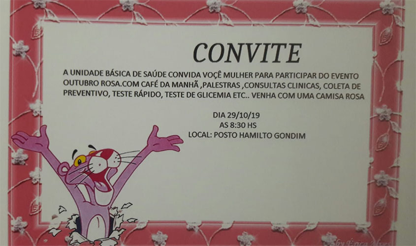 Na terça-feira (29) será realizado um evento para celebrar o Outubro Rosa, a partir das 8h30, na Unidade Saúde da Família Hamilton Gondim. Segundo a secretária municipal de Saúde, Eliana Pasini, serão realizadas consultas clínicas, exames de preventivo, glicemia, teste rápido e café da manhã.
