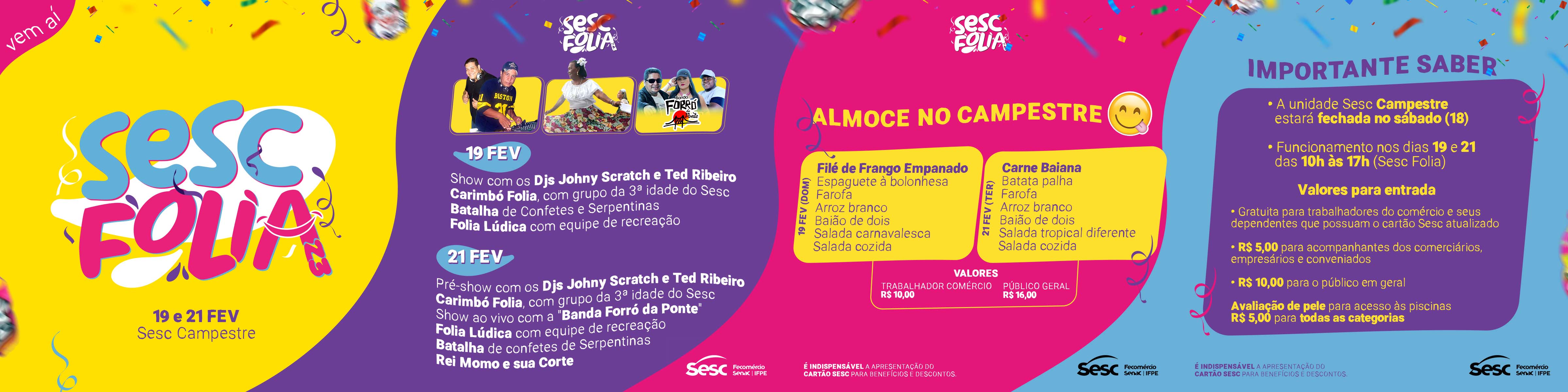 O Sistema Fecomércio/Sesc/Senac/IFPE, por meio do Sesc Rondônia, anuncia a retomada do Sesc Folia – projeto que leva programação cultural e recreativa para toda população, sobretudo aos trabalhadores do comércio, durante o período de carnaval. Nos dias 19 e 21 de fevereiro os foliões poderão desfrutar de uma programação diversificada nas dependências do Sesc Campestre, em Porto Velho, além de terem acesso às piscinas e demais estruturas de lazer da unidade.