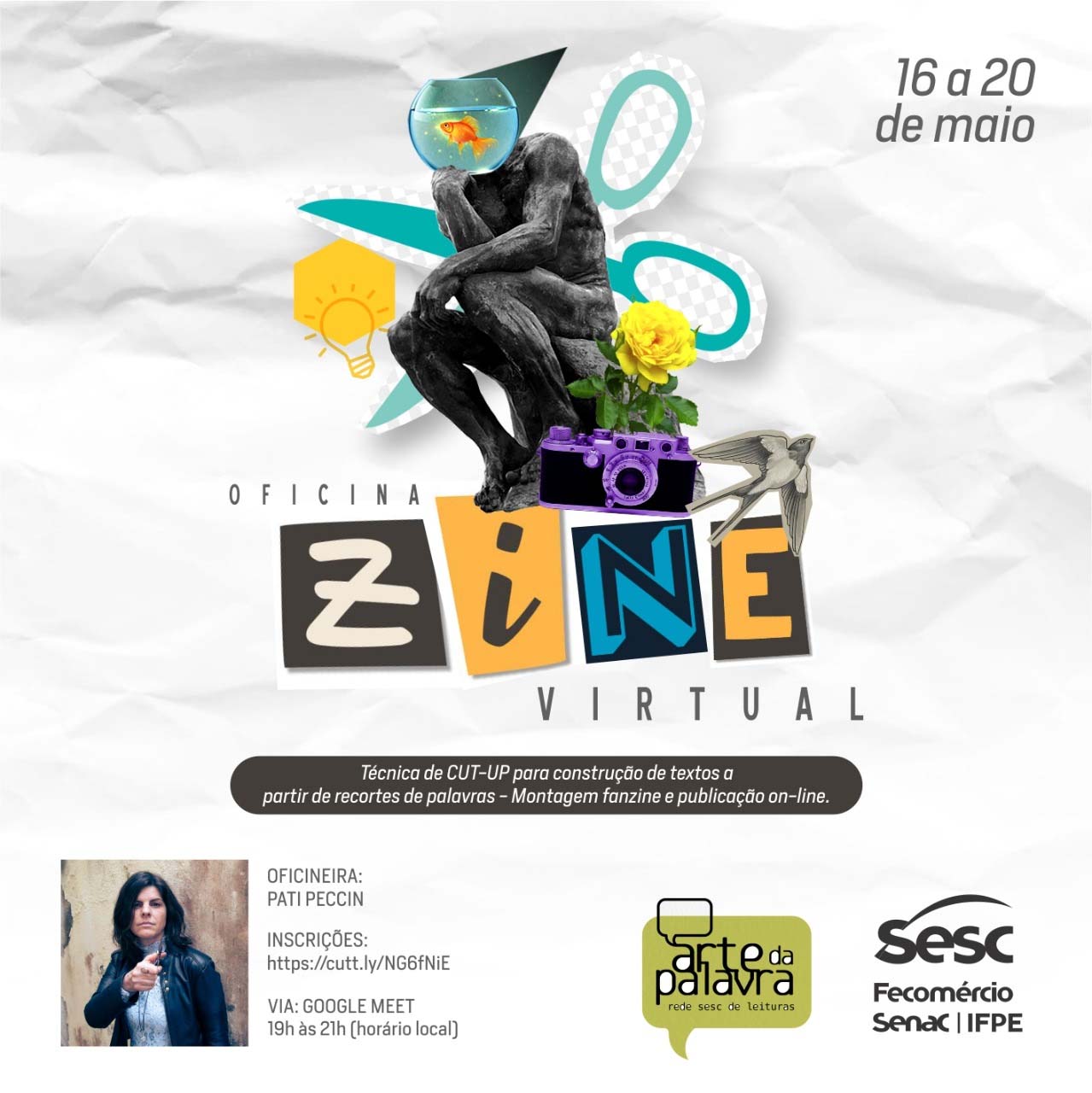 Estão abertas até o dia 14 de maio as inscrições para a Oficina de Zine Virtual - ação formativa realizada pelo Sistema Fecomércio/Sesc/Senac/IFPE, por meio do Sesc Rondônia, que tem como intuito propor a criação de um fanzine no formato e-book, através de encontros online, onde os participantes produzirão colagens com o tema proposto. Ministrada pela Ilustradora, Artista e Educadora Pati Peccin (SC), a atividade acontecerá de 16 a 20 de maio, das 19h às 21h (horário local), por meio da plataforma Google Meet.