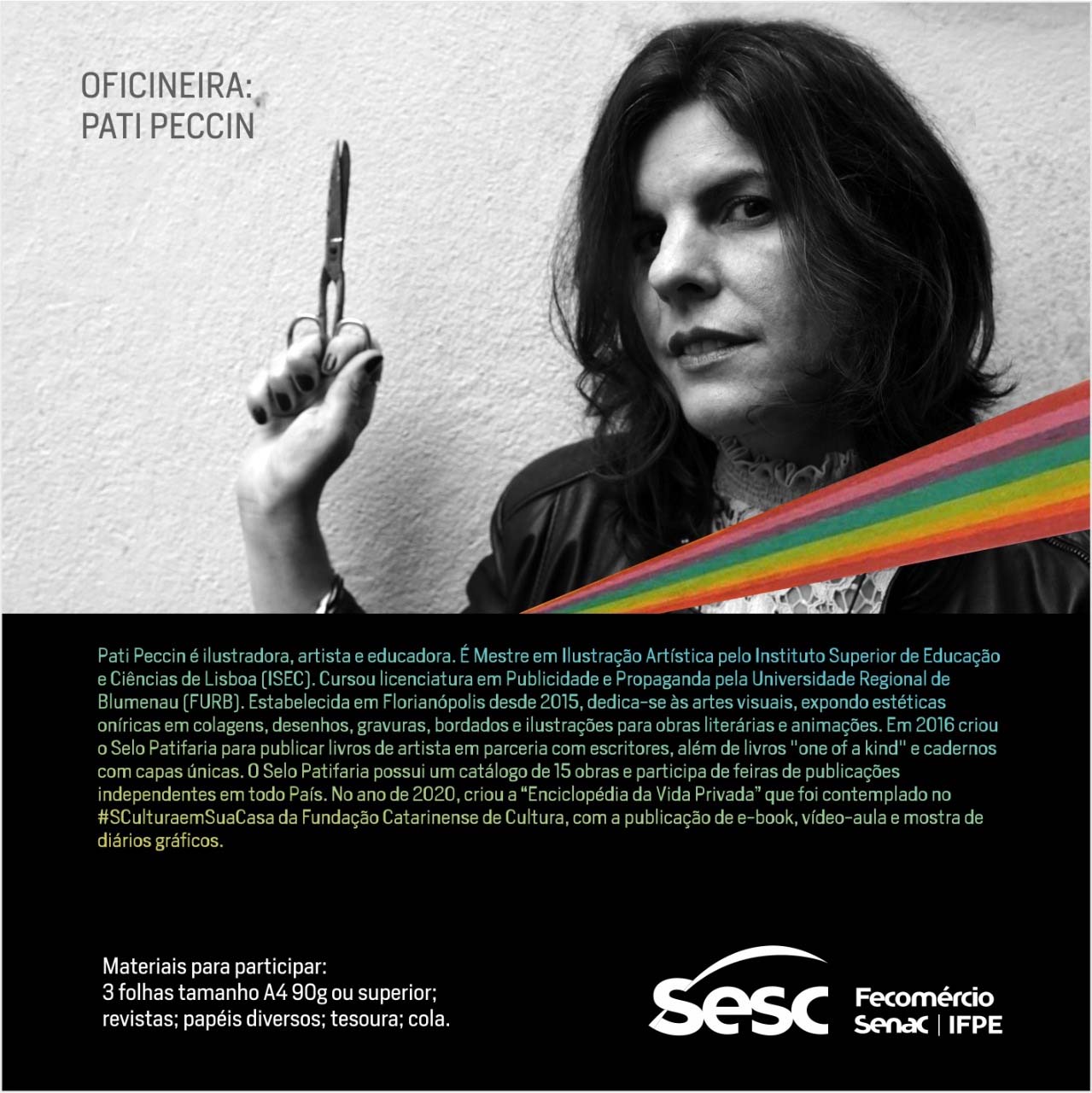 Pati Peccin é ilustradora, artista e educadora. É Mestre em Ilustração Artística pelo Instituto Superior de Educação e Ciências de Lisboa (ISEC). Cursou licenciatura em Publicidade e Propaganda pela Universidade Regional de Blumenau (FURB). Estabelecida em Florianópolis desde 2015, dedica-se às artes visuais, expondo estéticas oníricas em colagens, desenhos, gravuras, bordados e ilustrações para obras literárias e animações. Em 2016 criou o Selo Patifaria para publicar livros de artista em parceria com escritores, além de livros "one of a kind" e cadernos com capas únicas. O Selo Patifaria possui um catálogo de 15 obras e participa de feiras de publicações independentes em todo País. No ano de 2020, criou a “Enciclopédia da Vida Privada” que foi contemplado no #SCulturaemSuaCasa da Fundação Catarinense de Cultura, com a publicação de e-book, vídeo-aula e mostra de diários gráficos. Em 2020, Pati e Marko Martins produziram o videoclipe de animação em papel (cut-out) para a música “Revolution” da Orquestra Ouro Preto. A artista realizou diversas exposições, sendo selecionada em 2018 para expor "O Universo das Coisas Incontáveis'' no Museu Histórico de Santa Catarina e na Rede de Galerias SESC-SC, na unidade Joaçaba e Concórdia. Em 2021, para a Mostra SESC de Culturas, na unidade do Ceará, realizou a exposição virtual "O Paraíso das Preciosidades Perdidas". É educadora nas áreas de colagem e ilustração, tendo ministrado oficinas para instituições públicas e espaços culturais, dentre elas a Fundação Catarinense de Cultura, SESC/SC e UDESC - Universidade do Estado de Santa Catarina. Foi mediadora nas exposições Gaudi Barcelona 1900 e Palavra e Movimento de Arnaldo Antunes, ambos no MASC - Museu de Arte de Santa Catarina. Pati ainda conta com 13 anos de experiência no setor audiovisual no âmbito da cenografia e direção de arte em São Paulo.