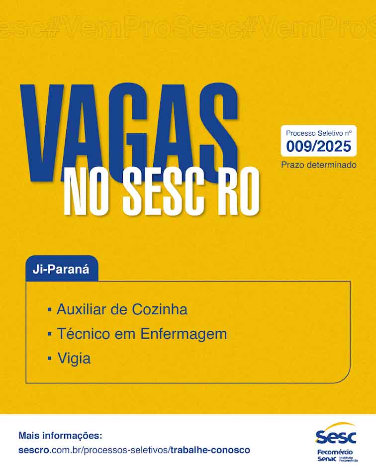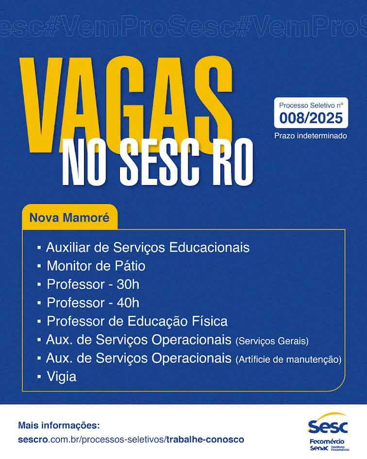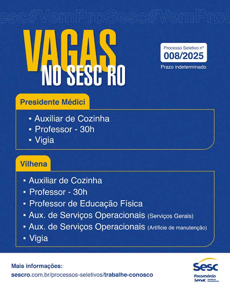 O Sistema Fecomércio/Sesc/Senac/IFPE, através do Sesc Rondônia, está com inscrições abertas para cargos destinados à formação de cadastro reserva para futuras contratações por tempo determinado e indeterminado, conforme a necessidade da instituição.