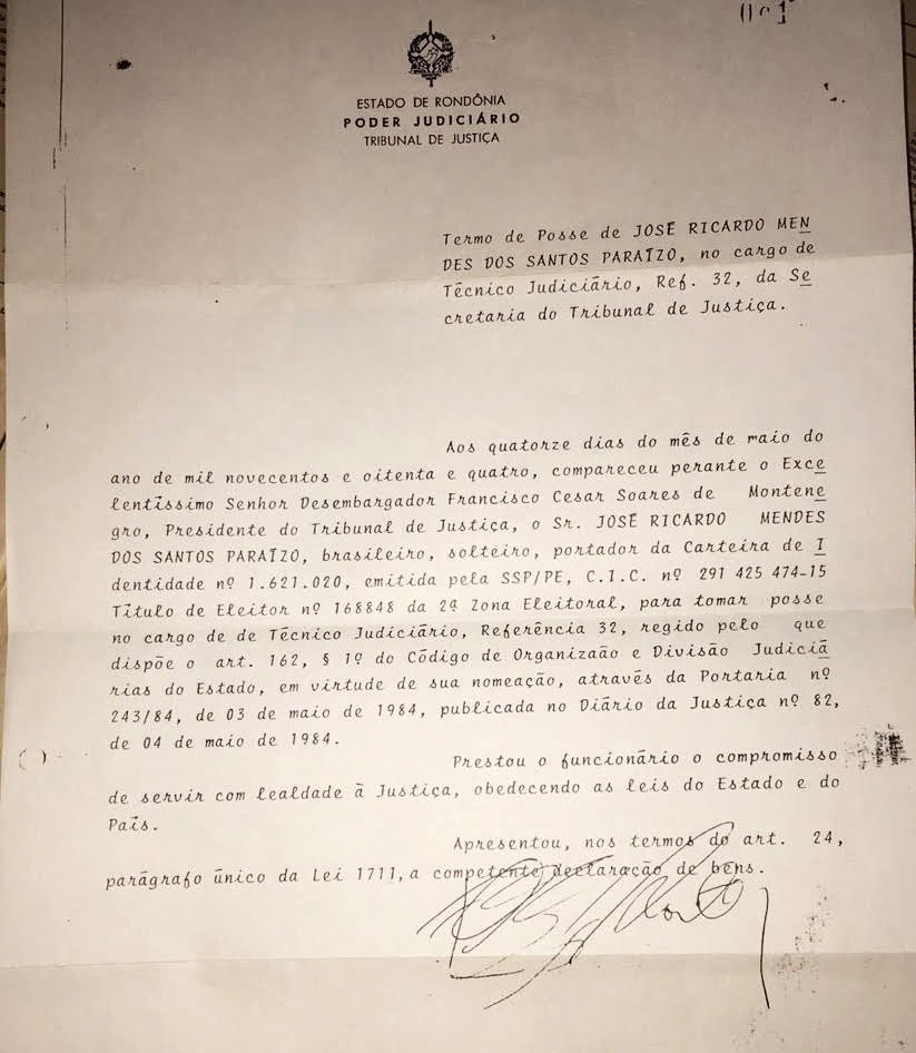 “Passados 35 anos, o sentimento que tenho é de dever cumprido, minha missão no serviço público do Judiciário já está se encerrando, com êxito e saldo positivo”, diz Ricardo Paraízo, 1º colocado no primeiro concurso público realizado pelo Tribunal de Justiça de Rondônia em 1983.