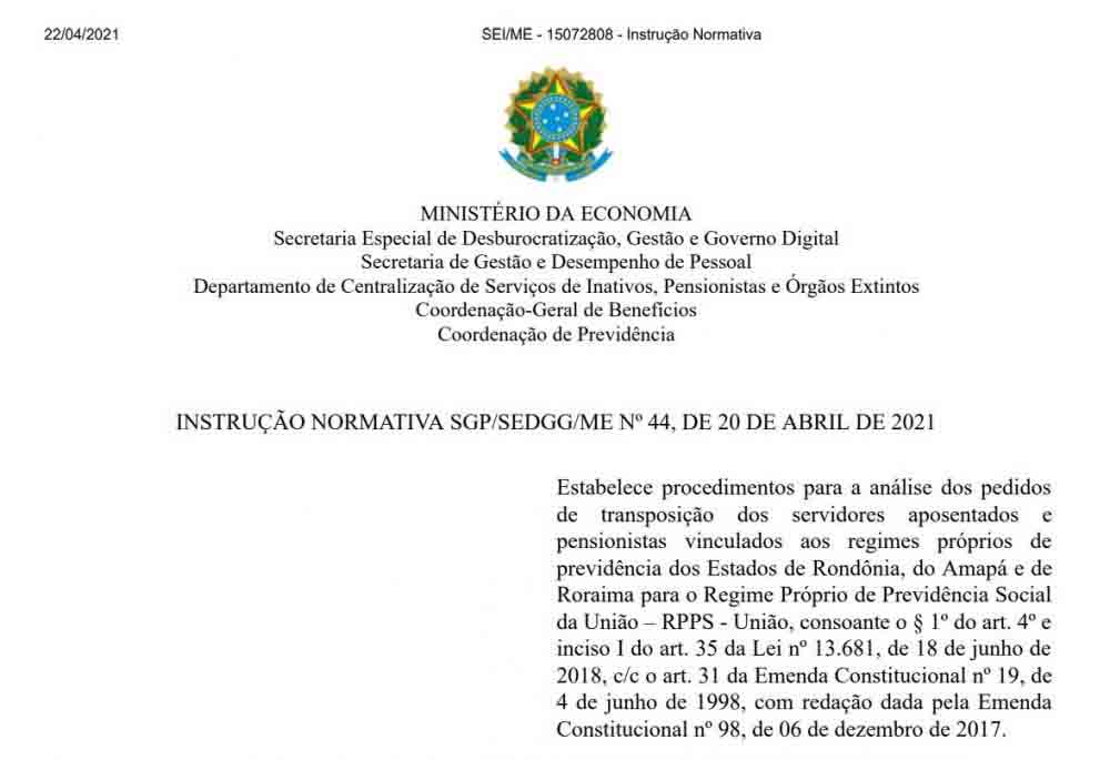O Sintero tomou conhecimento da Instrução Normativa nº 44, de 20 de abril de 2021, que estabelece procedimentos para análise dos pedidos de transposição dos servidores aposentados e pensionistas dos Estados de Rondônia, Amapá e de Roraima.