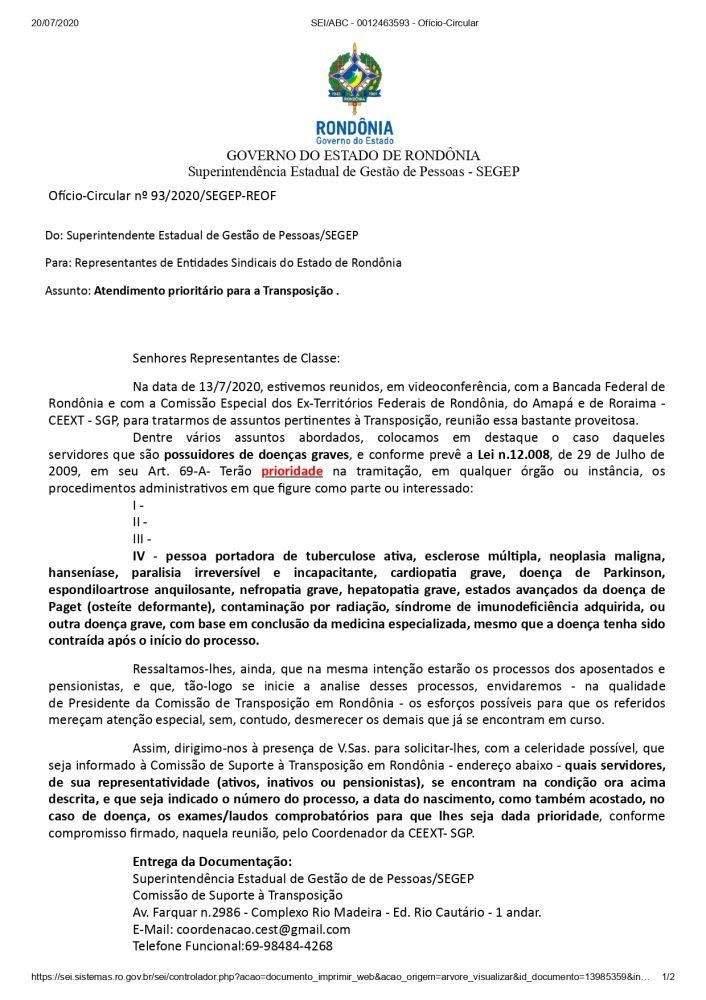 Em reunião com a Bancada Federal de Rondônia, com a Comissão Especial dos Ex-Territórios Federais de Rondônia, Amapá e de Roraima (CEEXT) e com o Sintero, bem como os demais representantes sindicais dos Estados, a Superintendência Estadual de Gestão de Pessoas (Segep) discutiu sobre os processos da Transposição, dando destaque ao pedido de celeridade na análise dos processos dos servidores portadores de doenças graves e que estão aptos para transpor, ou seja, aqueles beneficiados com a Lei 11.681/2018, que concede o direito aos contratados até 15 de março de 1987 . Na oportunidade, ficou acordado que o Estado encaminhará à Brasília, uma lista com o nome e a documentação dos servidores que possuem direito à tal prioridade.