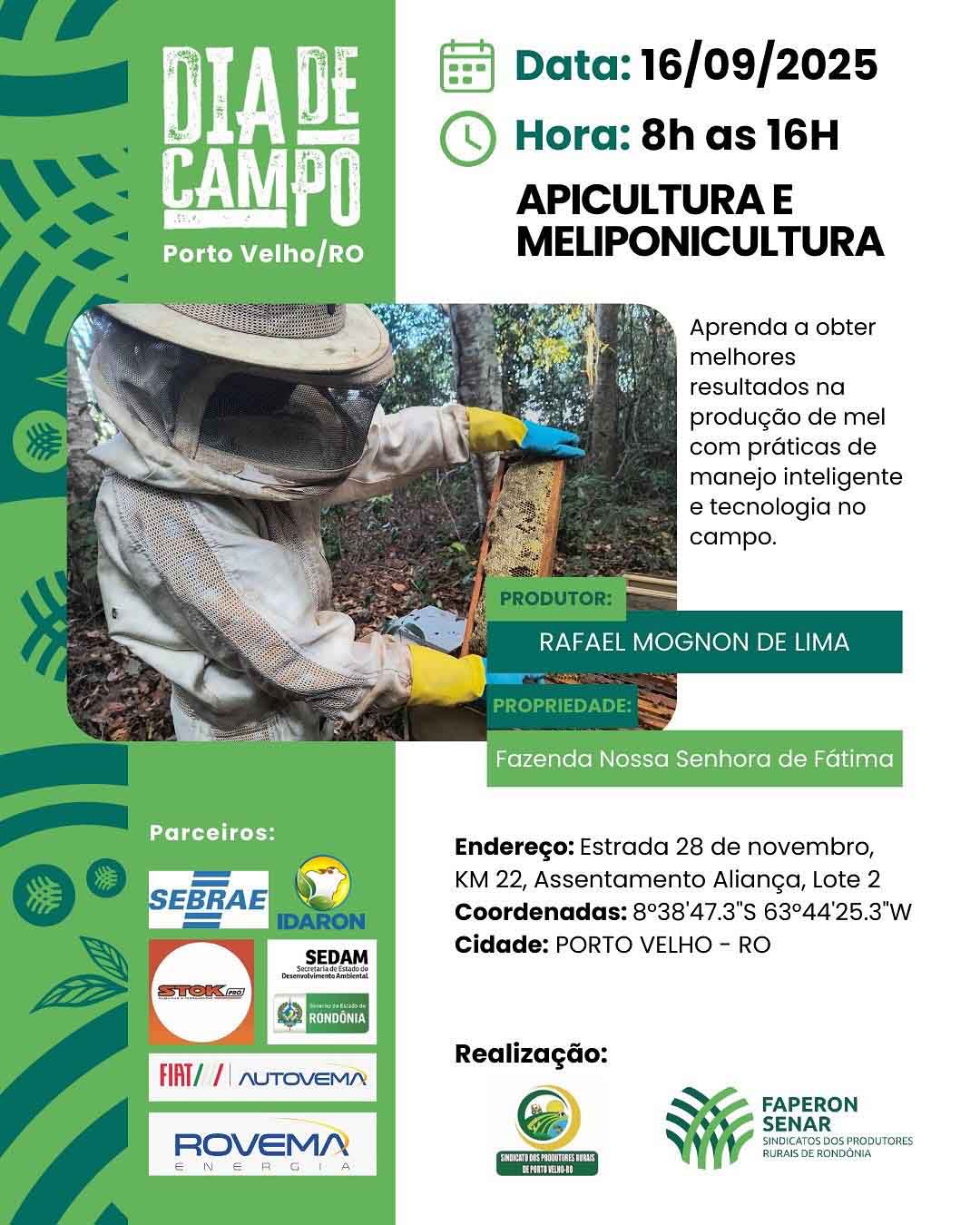 O Sistema FAPERON/Senar em parceria com o Sindicato dos Produtores Rurais de Porto Velho e o Sebrae, por meio do programa Juntos Pelo Agro, realizará no próximo dia 16 de setembro, o Dia de Campo em Apicultura e Meliponicultura, das 8h às 16h, na Fazenda Nossa Senhora de Fátima, propriedade do senhor Rafael Mognon de Lima, localizada na Estrada 28 de Novembro, Km 22, Assentamento Aliança, Lote 2, em Porto Velho.