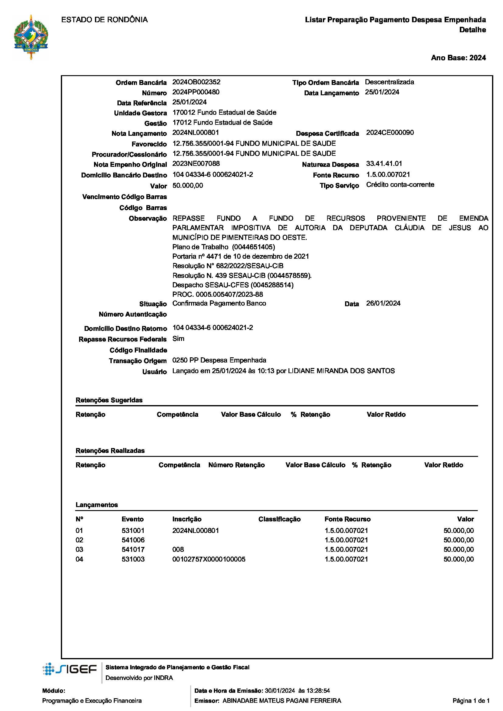 TÁ PAGO: Emenda parlamentar de Cláudia de Jesus leva mais saúde para Pimenteiras do Oeste