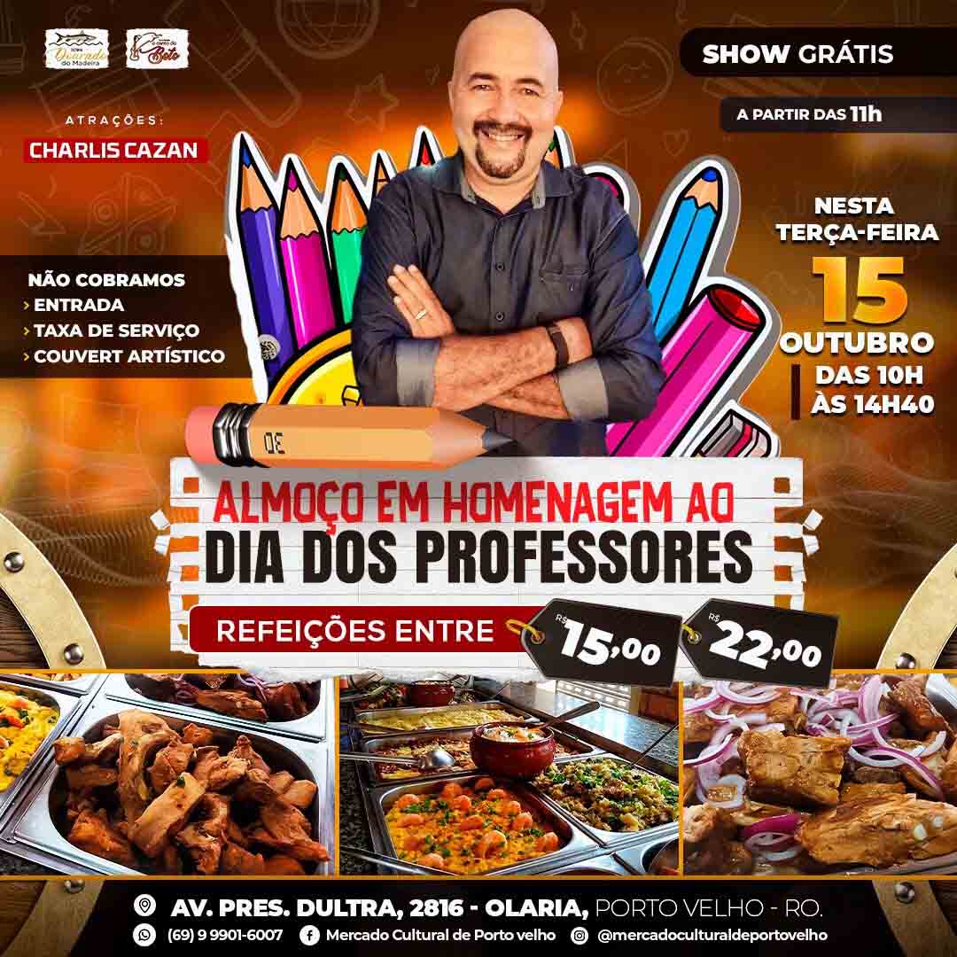“Parabéns a todos os professores!!! Nesta terça-feira, dia 15, das 10h40 a 14h40, preparamos um almoço especial para homenagear os nossos queridos mestres, com showzaço de Charlis Cazan no palco do Mercado Cultural de Pvh”, enfatizou o empresário Sinezio Tapajos, permissionário do box Dourado do Madeira, acrescentando que o show é gratuito e as refeições vão custar entre R$ 15.00 e R$ 22.00.